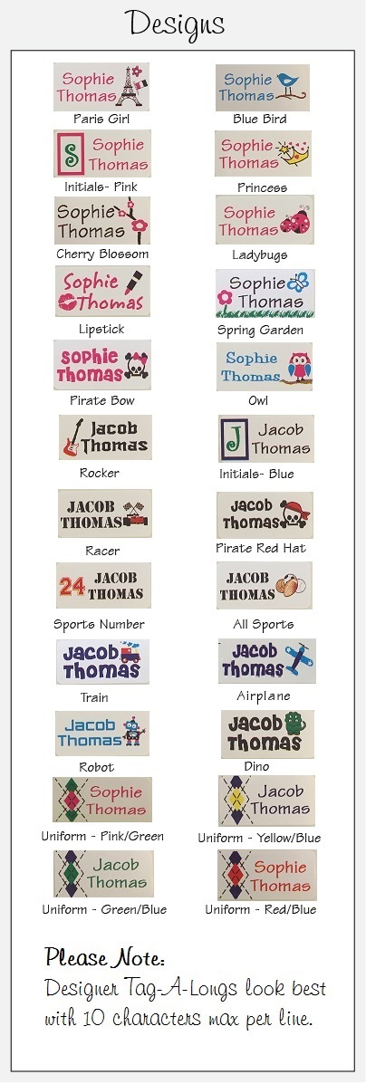Tag-A-Longs™ are a durable name label for kid's clothing, blankets and beach towels. They are easy to apply and can be used as a quick, on the go labeling solution. Just stick them directly to the tag. The kid's labels use high-quality ink and are will stay put, once applied. For tagless, items try out Classic Iron-Ons. Tip: Tag-A-Longs™ are also a good match for any plastic item.